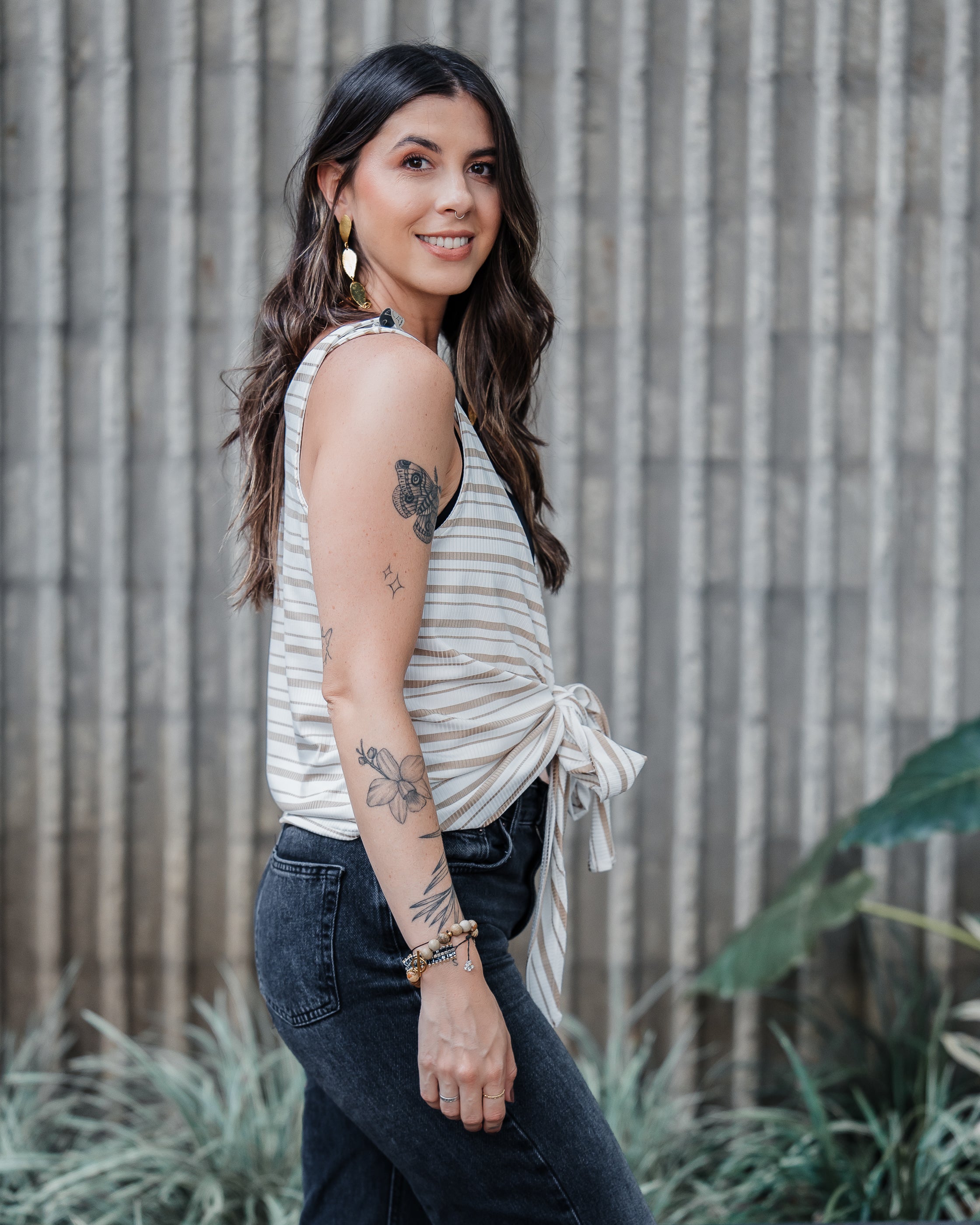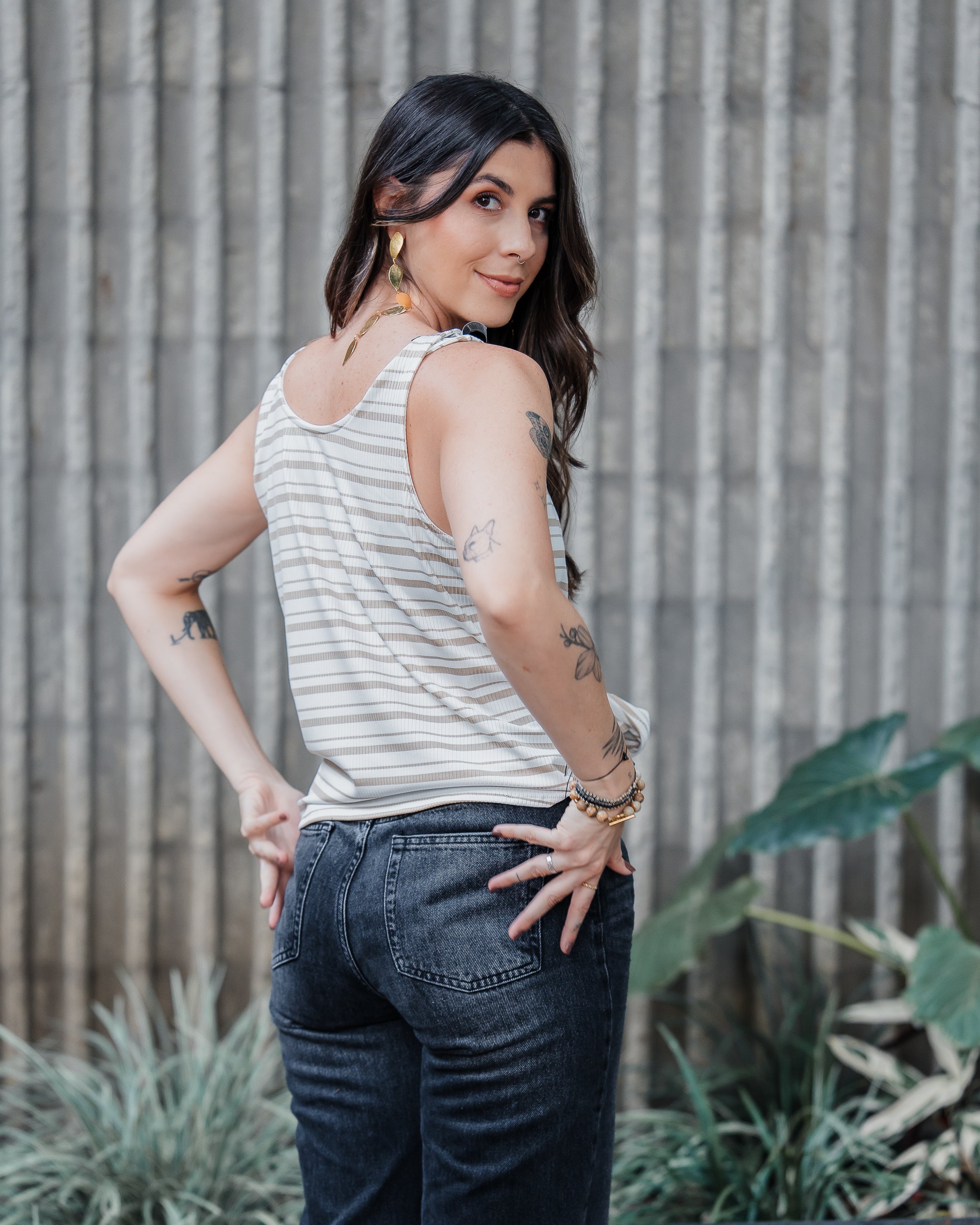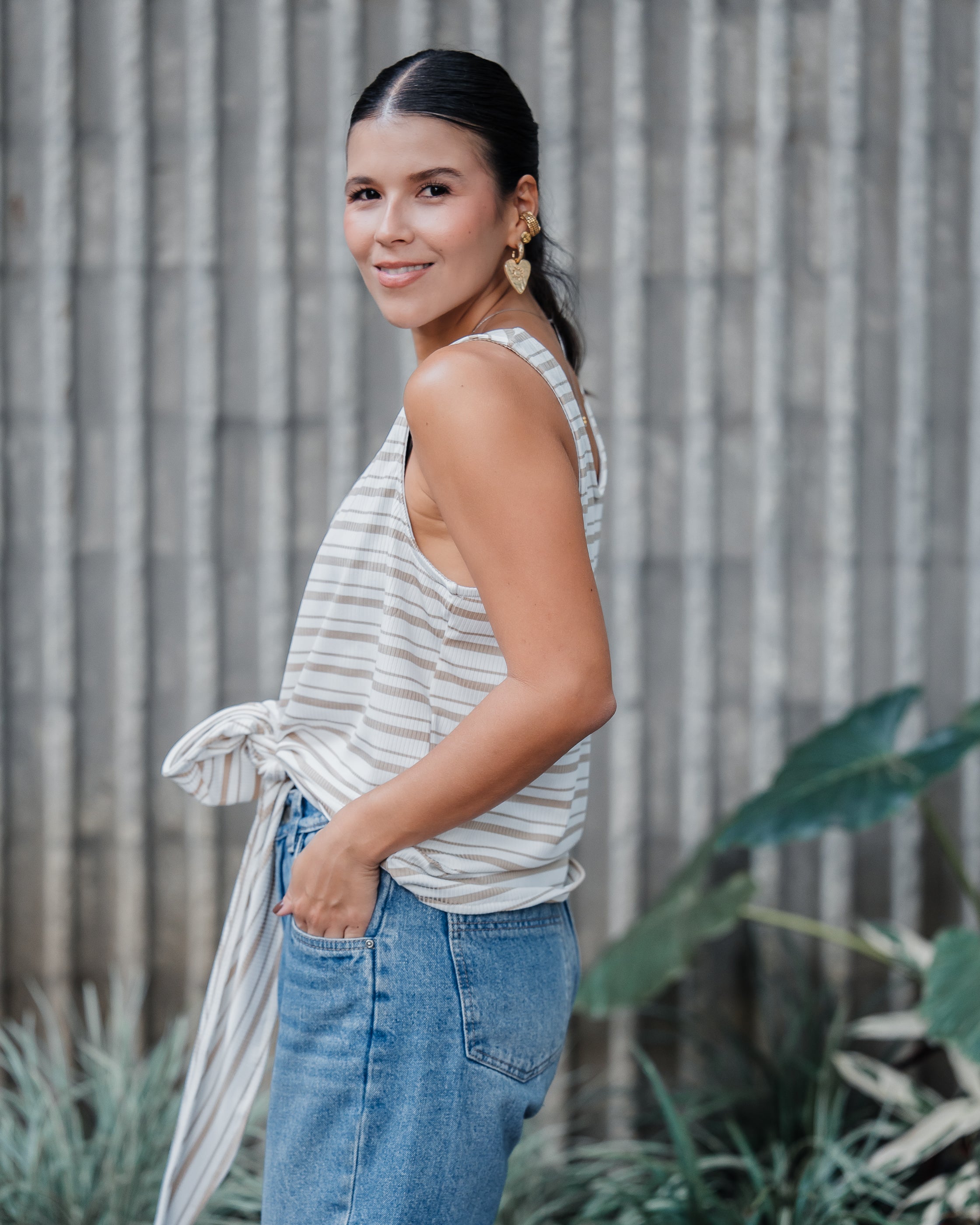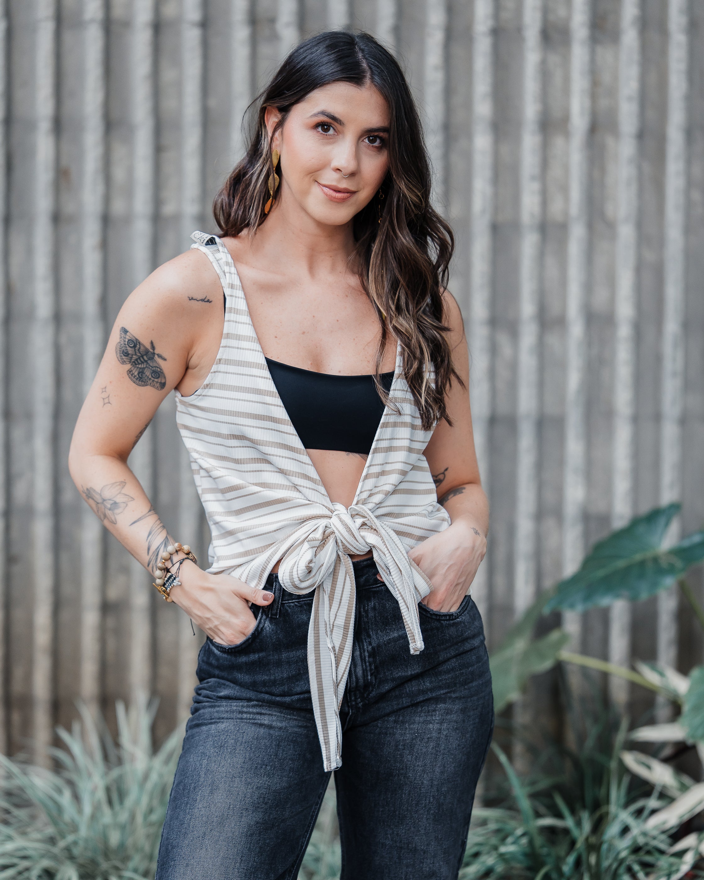 Puedes usar tu blusa chaleco anudado al frente o en la espalda, una prenda que eleva tus looks por su diseño, también puedes usarla con un top o una blusa por debajo.
