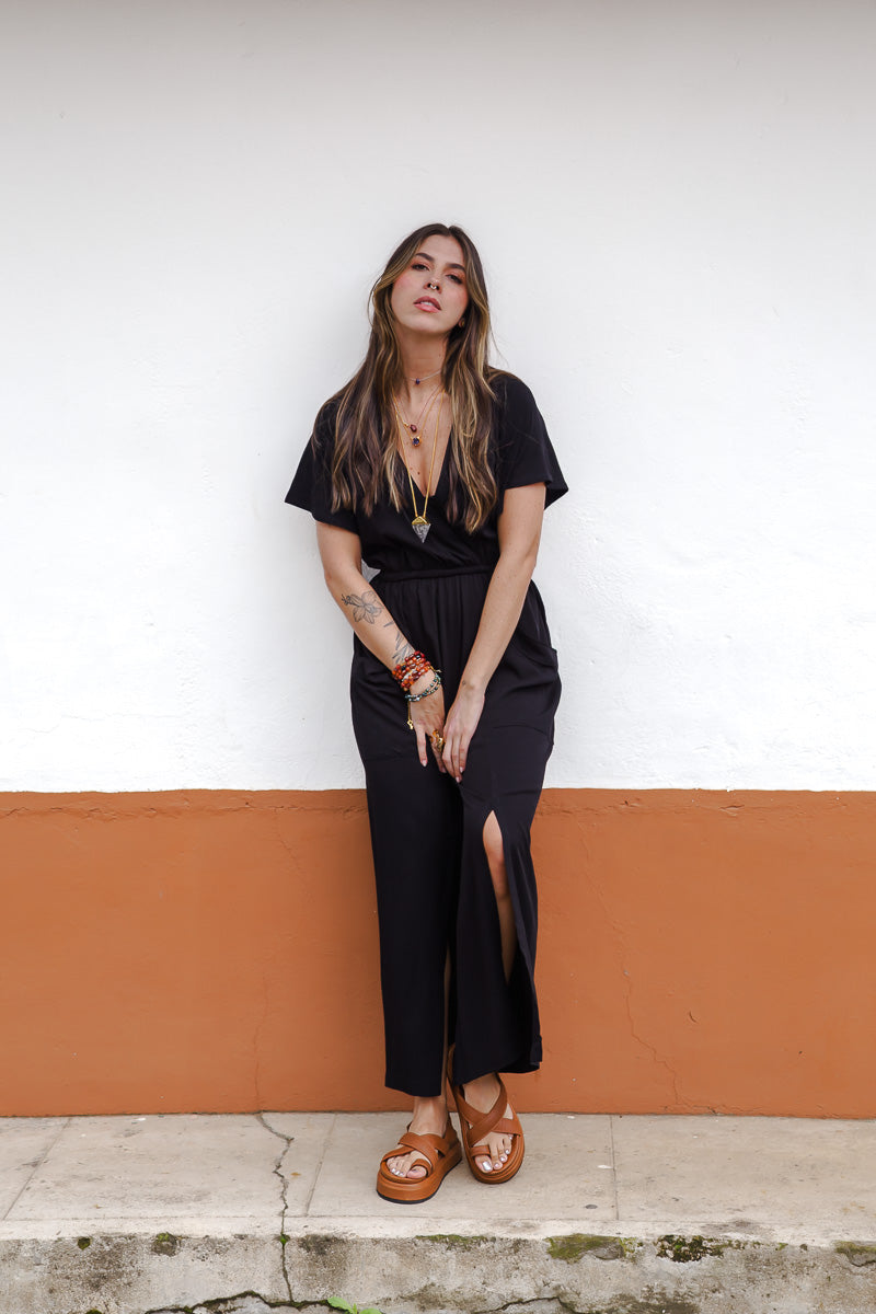 Es un vestido con cintura alta entallada y aberturas frontales que estilizan tu figura... Es muy cómodo!