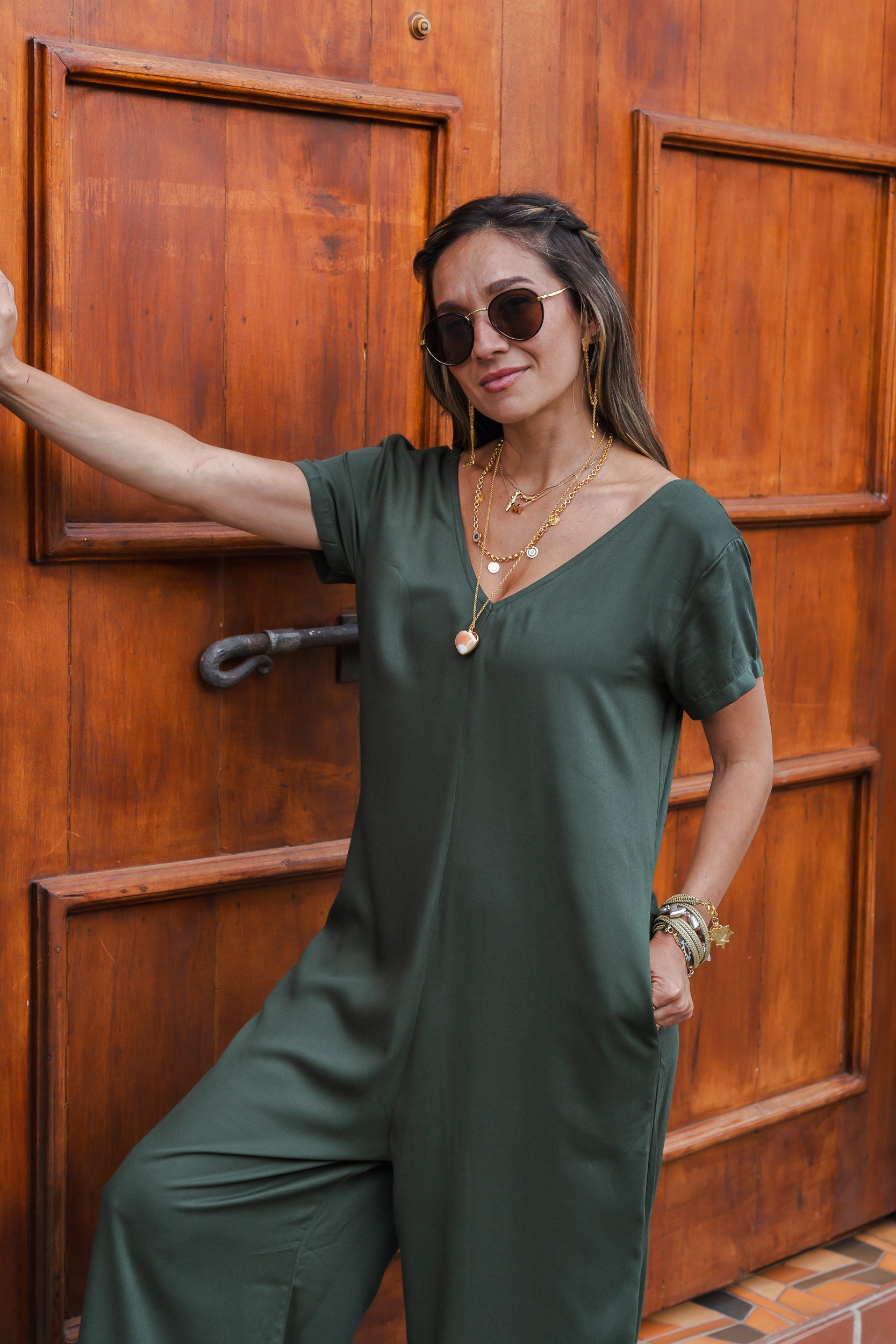 Un diseño muy cómodo por sus mangas, bolsillos y tiro largo. Su escote en V tanto en el frente como en la espalda son preciosos y estilizan tu figura.